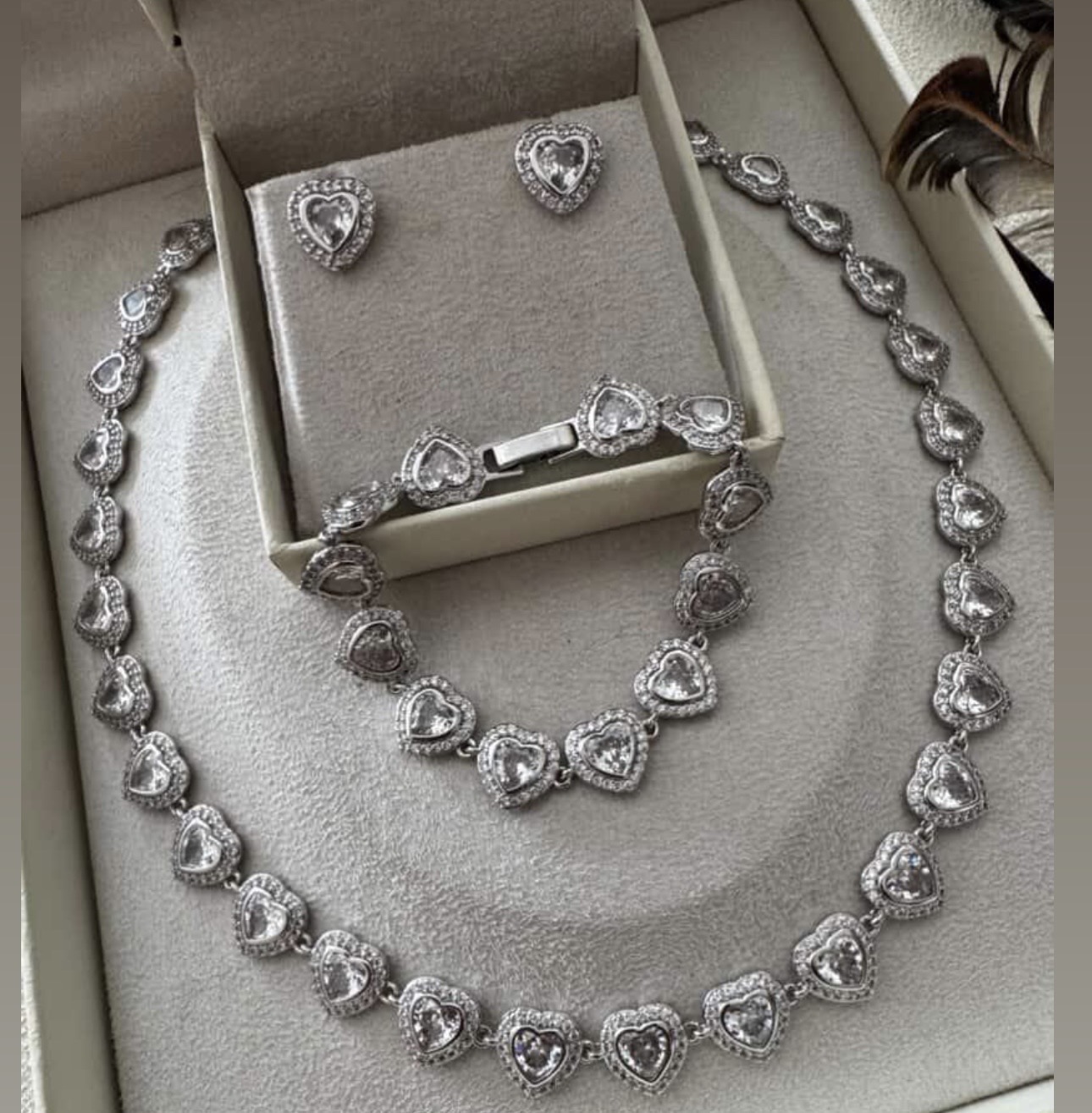 CONJUNTO COLAR E BRINCO CORAÇÕES CRAVEJADOS